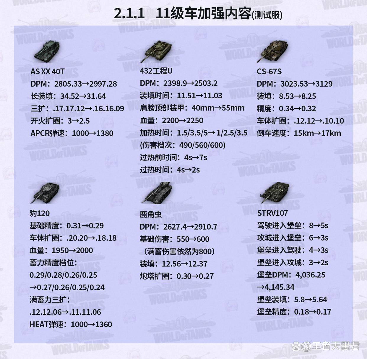 而2.0版块上线的那波旧十一级车之中,也有几台得回了针对性的均衡更正。中坦内部,豹120难绷的金币弹弹速和火控被加强;AS-XX 40t加强了银币弹弹速和火控;432工程U的幽默妙技也被加强,生活性和DPM也给了少许;底本也不差的CS-67S加强了倒车、少许火控和DPM。