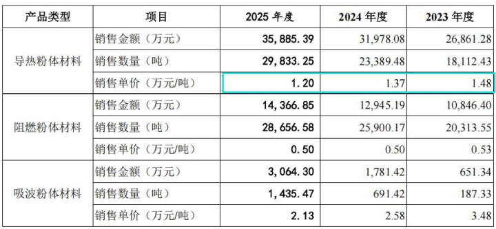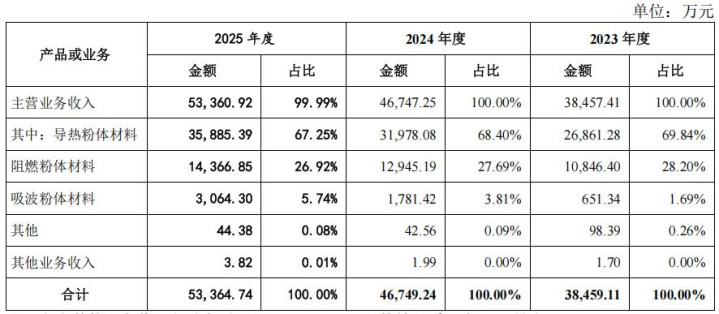 金戈新材导热粉体材料和阻燃粉体材料的整个销售额占确认期各期业务收入的比重远离为98.04%、96.09%和94.17%,是收入的主要着手。其中,导热粉体材料收入占比远离为69.84%、68.40%和67.25%。