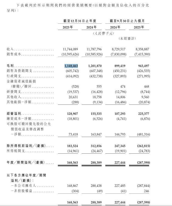 财务方面,钱大妈2023年、2024年两年营收分别为约117.44亿元、117.88亿元;毛利分别约11.49亿、12.01亿元;决议利润分别约为1.29亿元、1.55亿元。2025年前9个月,钱大妈营收约83.59亿元,上年同时约87.29亿元;毛利约9.43亿元,上年同时的毛利约8.99亿元;钱大妈2025年前9个月决议利润约为2.25亿元,而上年同时的决议利润约1.07亿元。