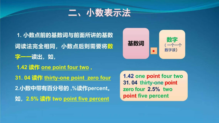 1. 读法:极少点前按基数词读,极少点后需逐一读出数字