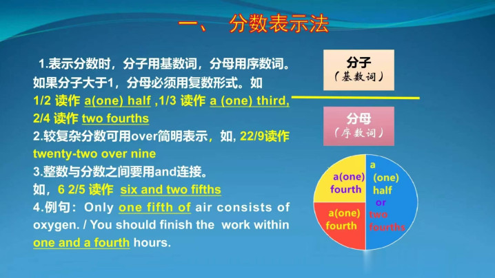 1. 基本结构:分子用基数词,分母用序数词;分子>1时,分母用复数款式