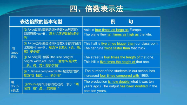 ④ …times + compared with + 被比较对象 与…比较,……若干倍 The number of the students in our school has increased four times compared with 1980.