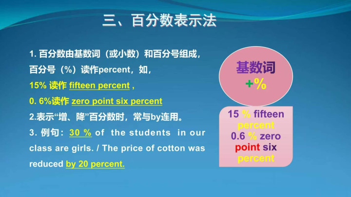 1. 结构:由基数词(或极少)+ 百分号(%)构成, % 读作 percent