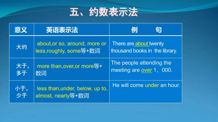 1.大略 about, or so, around, more or less, roughly, some + 数词 There are about twenty thousand books in the library.