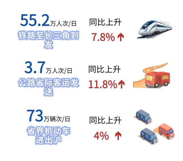 2025年,上海与长三角地区铁路日均游客到发量55.2万东说念主次/日,公路省际日均发送量3.7万东说念主次/日,省界天真车收支沪日均流量约73万辆次/日,三者同比均有不同进度飞腾。
