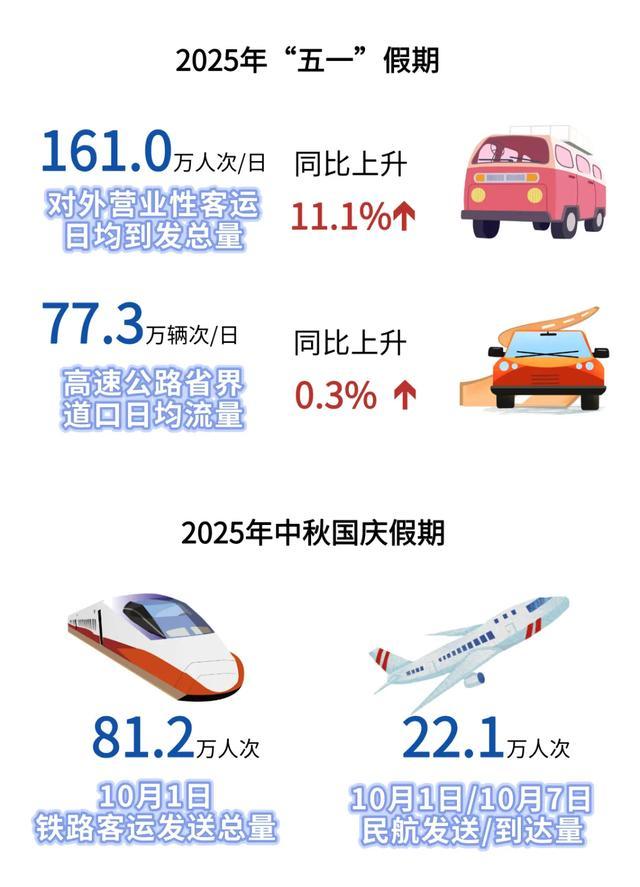 铁路、民航在中秋国庆假期刷新单日客流岑岭记录:10月1日铁路对外发送81.2万东说念主次;民航10月1日发送岑岭、10月7日到达岑岭客流均为22.1万东说念主次。