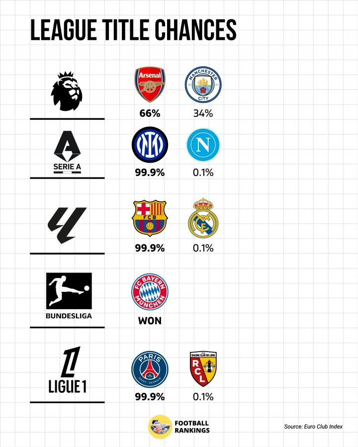 直播吧04月27日讯欧洲五大联赛行将迎来五月份的冲刺收官阶段,FootballRankings援用EuroClubIndex的数据,抢庄牛牛官网陈列出了五大联赛的最新夺冠概率。