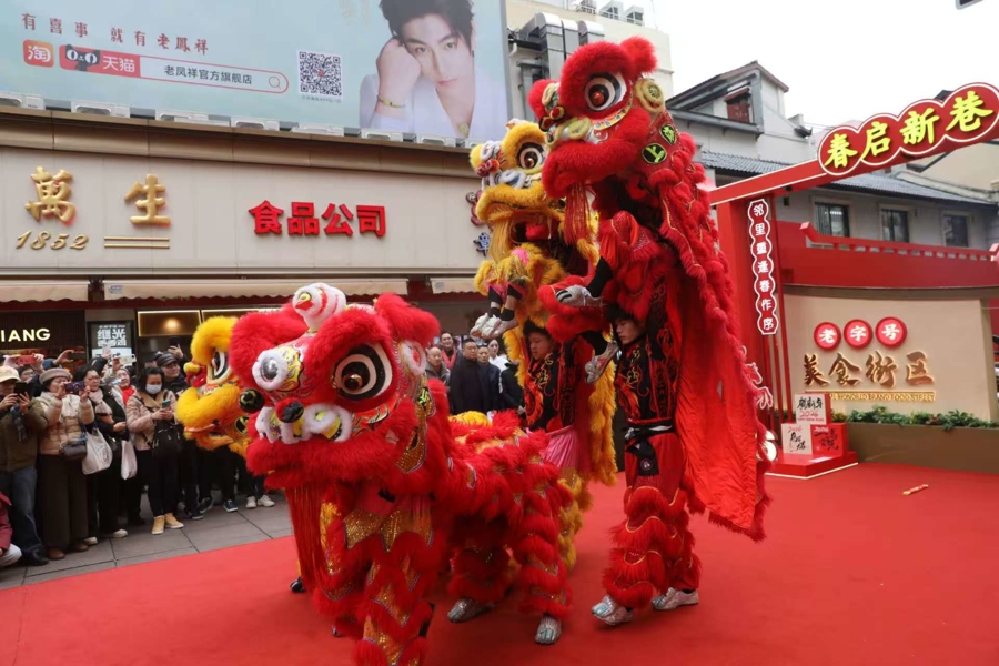 开街庆典上,祥狮欢舞,为每家老字号点睛采青,寓意着祯祥与焕新。