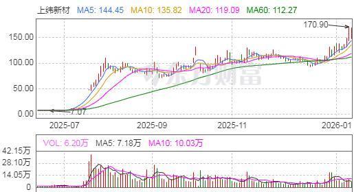 二级市集上,自2025年7月1日以来,上纬新材股价累计高涨近2000%,其间屡次20%涨停。1月12日,上纬新材涨幅达11.19%,铁心1月13日午间收盘,上纬新材再度高涨1.66%,股价创下历史新高,市值升至656.6亿元。