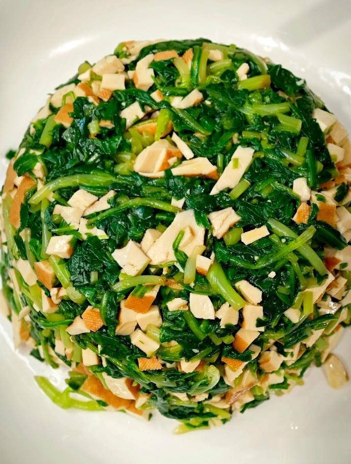 作念法:马兰头洗净焯水,挤干水分切碎。香干也切碎丁。